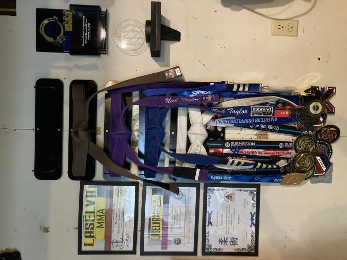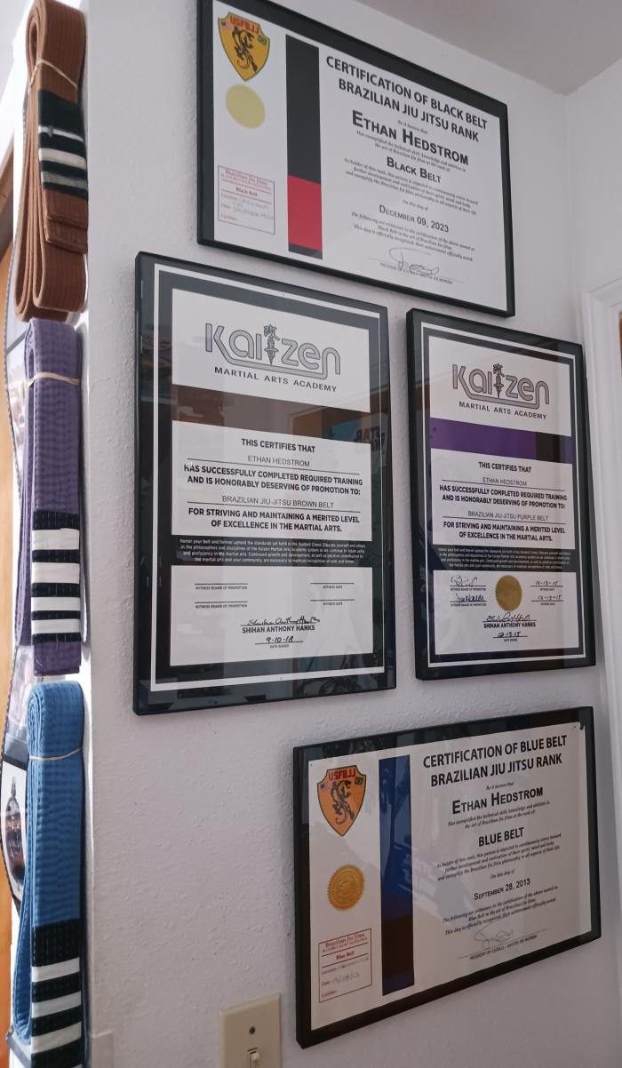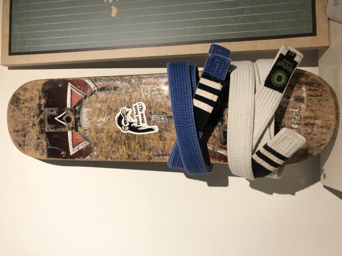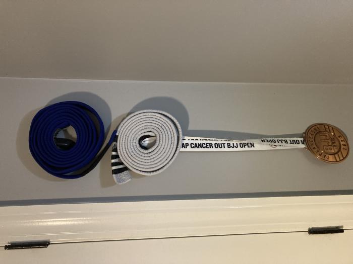 "Like a few others here, I use my training partners as belt displays, it's pretty cool. I tend to buy nicer belts than our standard academy ones, and when I graduate to a new rank, I give the previous grade belts to whoever needs or wants them. It's nice to see my old belts around my friends' waists."