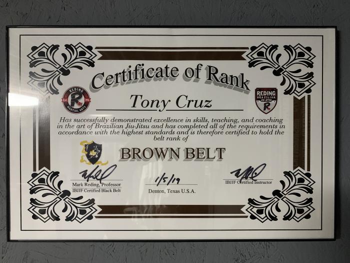 Received my blue belt from Coach Steven Garza, and then became an Independent affiliate of Reding Martial Arts, under the direction of Professor Mark Reding, who I received my stripes from