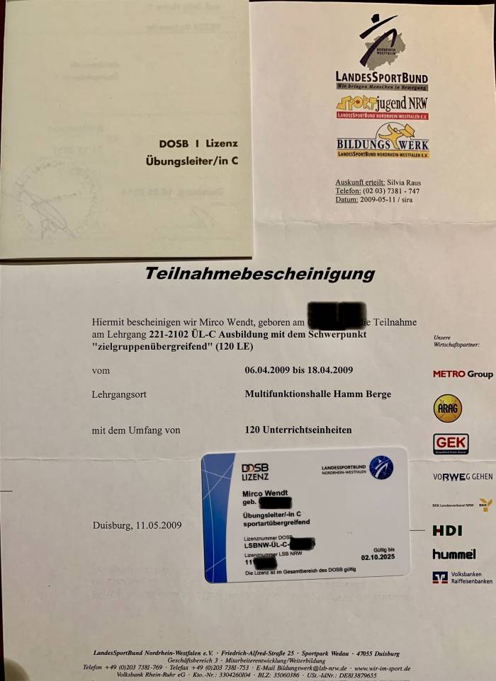 | PT license course German Olympic sports confederation: 120 course units/ Ausbildung Sportübungsleiter C-Lizenz DOSB; 06.04.-18.04.2009 | ![]() |