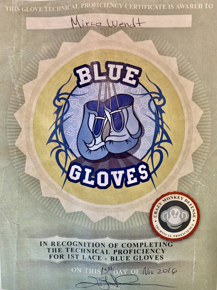 | Got „blue gloves“ certified in the CMD Boxing System by Muay Thai, Boxing and BJJ Coach Eric Kolesar from Everett Washington at a 3 days boxing clinic after sparring | ![]() |