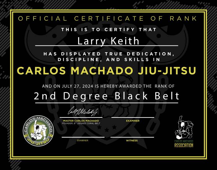Lineage: For Jiu-jitsu -- Jigoro Kano → Tomita Tsunejiro → Mitsuyo "Count Koma" Maeda → Carlos Gracie Sr. and Helio Gracie → Carlos "Carlinhos" Gracie Jr. and Rolls Gracie → Carlos Machado → Larry Keith For Kodokan Judo -- Jigoro Kano → Kazuzo Kudo → Yuzo Kato → Larry Keith