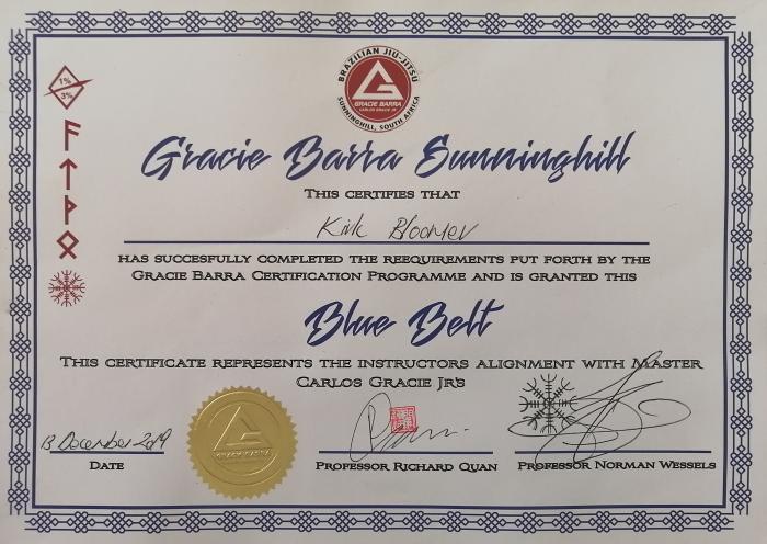 Awarded by Richard Quan and Norman Wessels of Gracie Barra Sunninghill