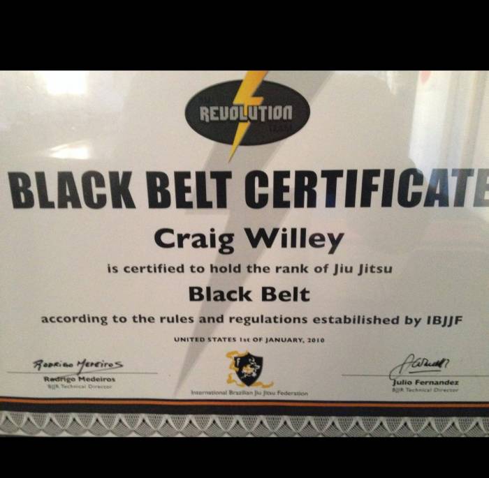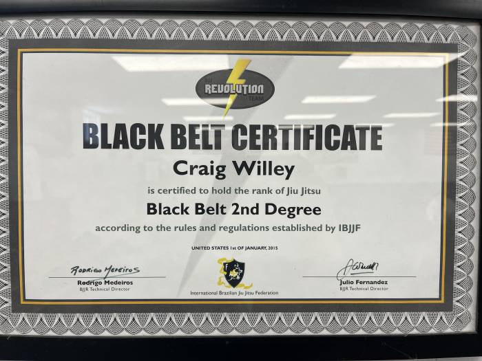 BJJ Black Belt, started training in BJJ in 1999 and earned first blue belt with Royce Gracie, second blue belt from Carlson Gracie Senior and Julio "Foca Fernandez", then promoted up through 2nd degree blackbelt under Professor Fernandez in 2015.