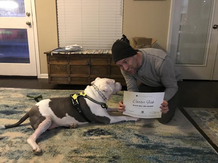 Showing off my new Belt Checker certification to my dog Hank