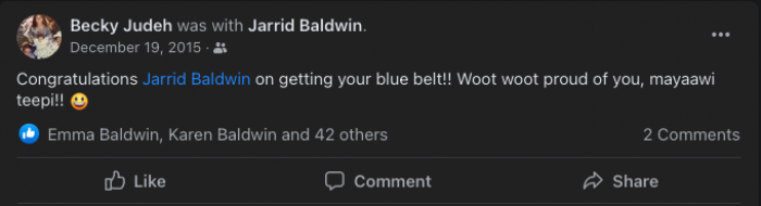 Congratulations on being promoted to purple belt today!!!! Much deserved! 4 year(s) ago |