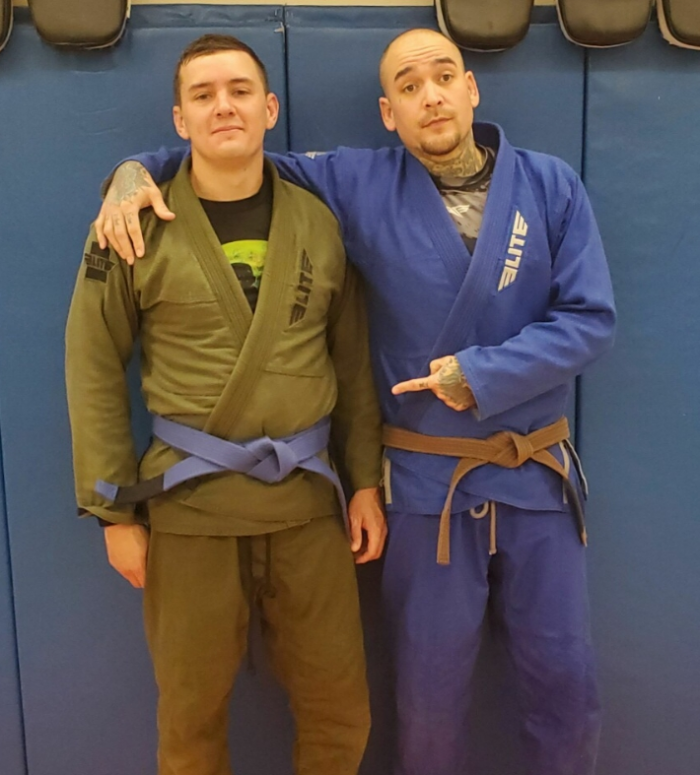 Caleb & coach Alex. Caleb, one of my main teammates that helped me level up. This is us with our fresh blue belts.