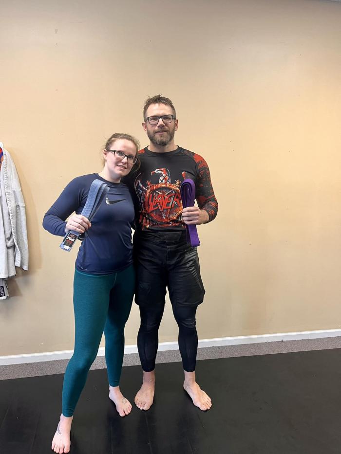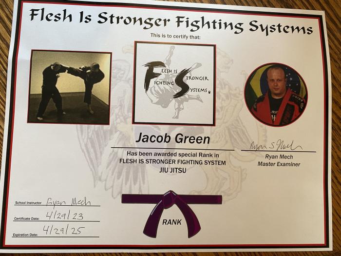 My martial arts journey began in early 2013 when I started training Kihon Okinawan karate. While I wasn't dedicated to grappling at the time, our karate system had a bit of jiu jitsu in it and to get more competition experience I entered my first grappling tournament, the MSOA Gladwin Open in Gladwin, MI in August 2014, taking second place in my division. In mid 2019 I shifted my focus to grappling and enlisted as a full-time student under Ryan Mech, a brown belt in BJJ and level 8 brown belt in Hayastan MMA under Gokor Chivichyan. I have been a full-time student ever since, and received my purple belt from Ryan in April 2023. I currently coach kids and adult classes at our satellite school in Roscommon, MI.