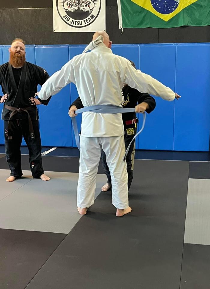 My Blue Belt promotion. Coach Perkins putting my Blue on me 4/13/24