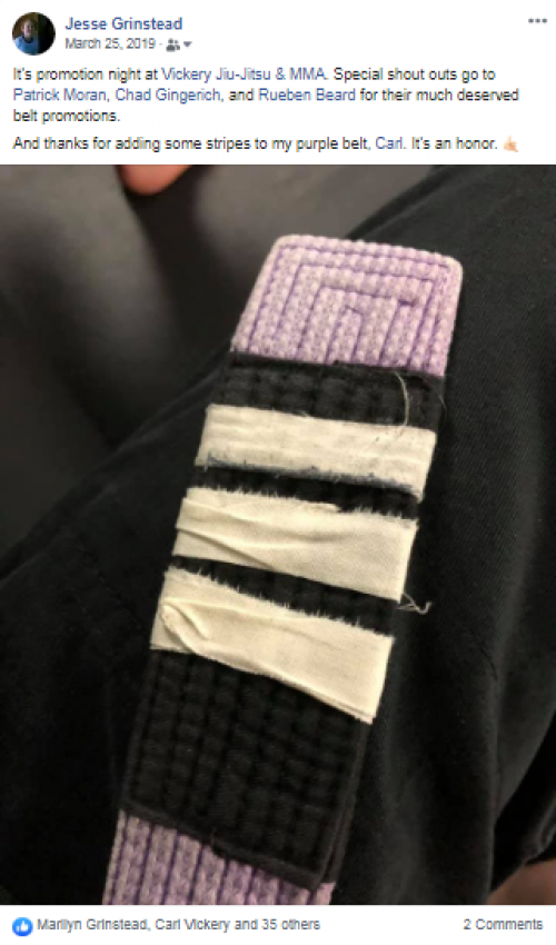 Promoted by: Carl Vickery (belt and first three stripes), Wyatt Weatherford (4th stripe)