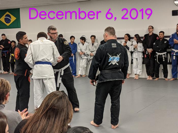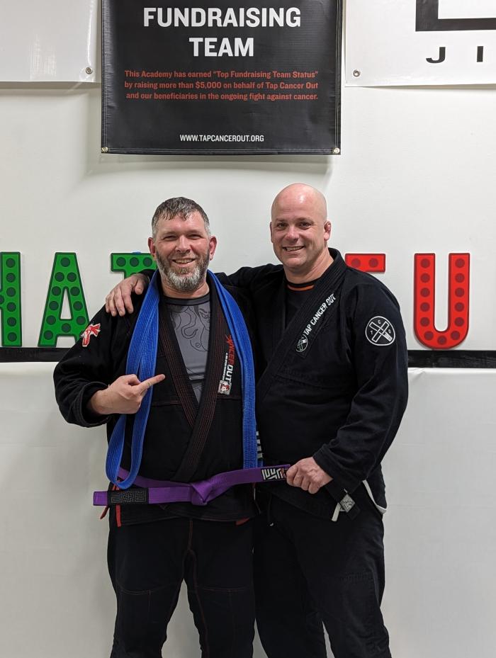 Promoted to purple belt after 60-minute no-breaks roll for Tap Cancer Out's 2023 Global Grappling Day; 1st stripe November 8 '24
