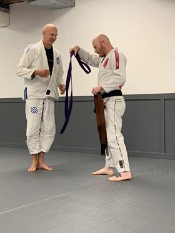 Professor Carlson Gracie Jr filled in on a private for Jeff Neal who fells sick at the time. I trained with Jr for about an hour, and at the end he gave me my purple. No one else was there, though the School knew at the next class.